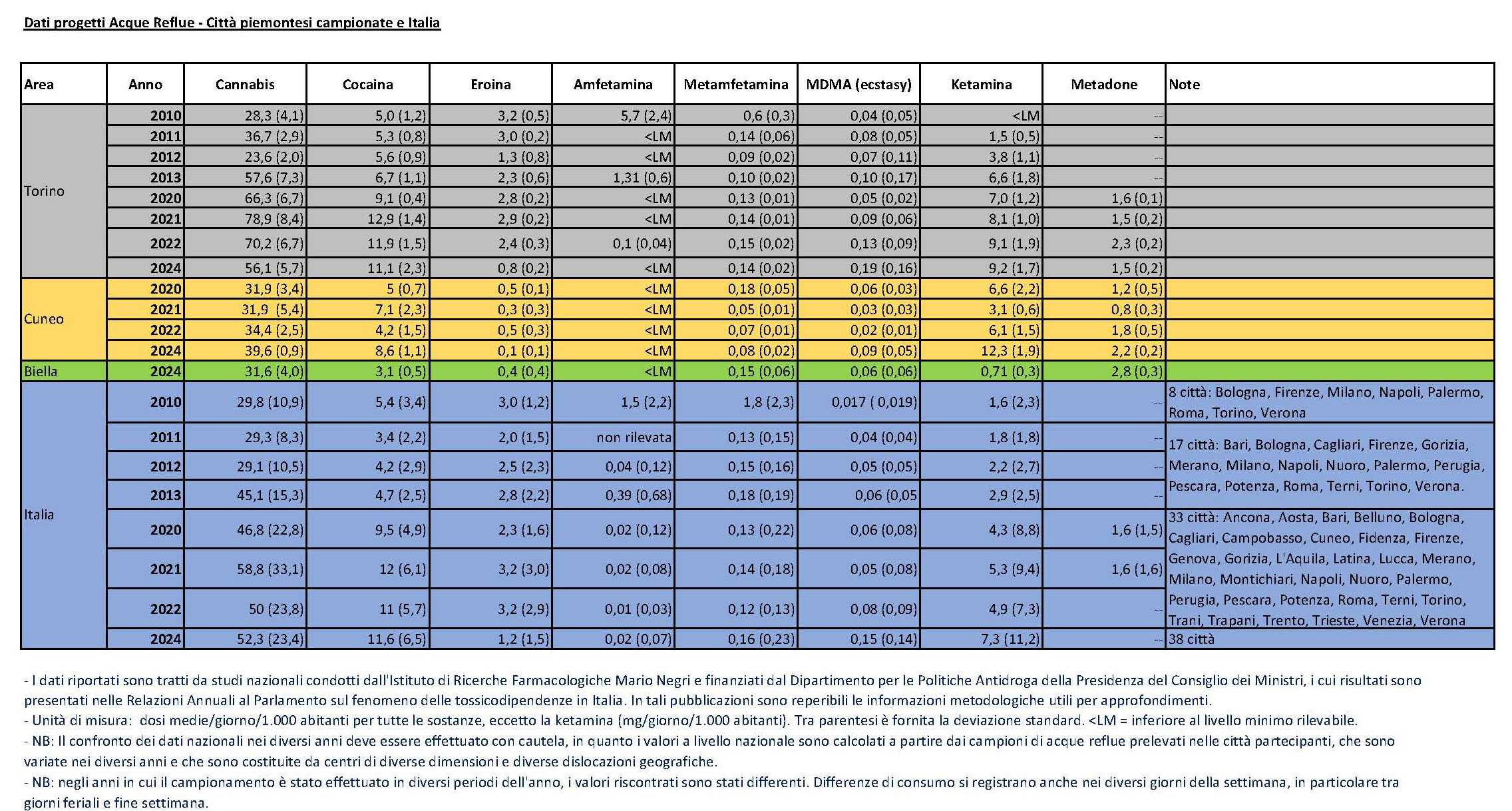 - Progetto Acque reflue: l’analisi dei residui metabolici delle sostanze stupefacenti nelle acque reflue, acque che sono state utilizzate e poi rilasciate nella rete fognaria, e che quindi contengono sostanze organiche e inorganiche prodotte in attività umane, domestiche, industriali o agricole, incluse tracce di sostanze assunte dalla popolazione. permette di stimare quali e quante sostanze vengono complessivamente consumate da tutta la popolazione afferente ai depuratori oggetto di monitoraggio. Si tratta di un sistema complementare ai metodi tradizionali di ricerca epidemiologica basati sugli studi di popolazione, che forniscono invece informazioni sugli utilizzatori (quanti, in quali fasce di età, con quali caratteristiche e quali pattern di utilizzo), non disponibili in questo tipo di studio. In Italia, il progetto “Acque reflue”, coordinato dall’Istituto di Ricerche Farmacologiche Mario Negri, persegue gli obiettivi di monitorare l’andamento dei consumi delle sostanze psicoattive “maggiori” (cocaina, amfetamina, ecstasy, metamfetamina, eroina e cannabis), identificare la presenza di nuove sostanze psicoattive (NPS), e valutare la loro diffusione sul territorio. La rete di rilevamento nazionale è attualmente costituita da più di 30 centri urbani, equamente distribuiti nelle regioni italiane consentendo di ottenere dati qualitativi e quantitativi di utilizzo delle sostanze psicoattive nel territorio italiano. Informazioni sulla metodologia e sui risultati (nazionali e/o per area e/o per centro urbano) sono reperibili nelle Relazioni Annuali al Parlamento sul Fenomeno delle Tossicodipendenze in Italia degli anni 2011, 2012, 2013, 2014, 2021, 2022, 2023 e 2024 (https://www.politicheantidroga.gov.it/it/notizie-e-approfondimenti/relazioni-annuali-al-parlamento/). Una sintesi dei dati nazionali e dei centri urbani piemontesi è disponibile nella tabella seguente: